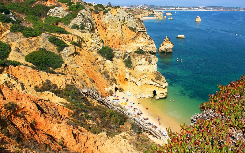 Située dans la ville de Portimão, dans l’Algarve, Praia da Rocha est une plage de sable doré bordée de falaises escarpées. La plage s’étend sur plus d’un kilomètre et est entourée de bars, de restaurants et d’hôtels comme solution d’hébergement. La vue depuis le sommet des falaises est tout simplement incroyable, offrant une vue panoramique sur l’océan Atlantique. La plage elle-même est bien équipée, avec des chaises longues et des parasols à louer. Les sports nautiques tels que la planche à voile, le jet ski et la plongée sous-marine sont également disponibles. Praia da Rocha est l’une des plages les plus populaires de l’Algarve, et il est facile de comprendre pourquoi.